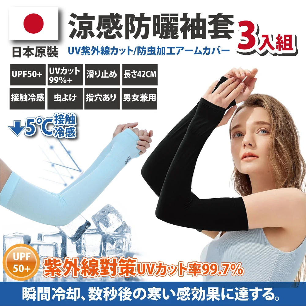 Akiko Sakai 日本原裝-紫外線對策接觸冷感速降5℃防曬涼爽成人/兒童袖套-三入組(防曬涼爽)
