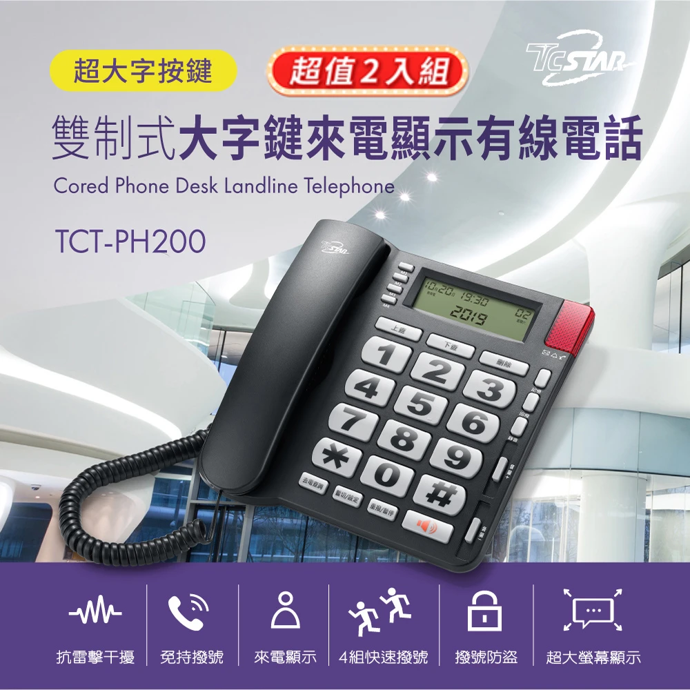 TCSTAR 二入組_來電顯示大字鍵有線電話(TCT-PH200BK-2)