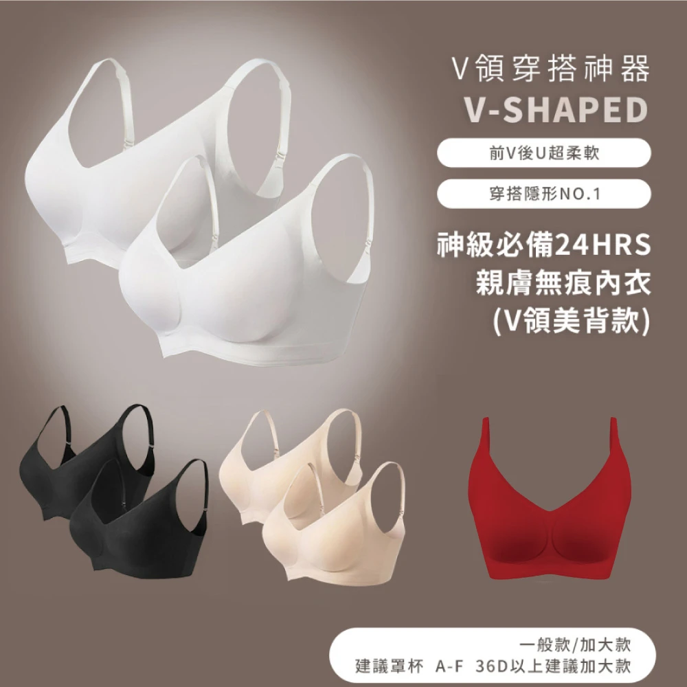 24HRS 2件組-V領美背款 親膚無痕內衣 大尺碼 4色任選(無鋼圈內衣 女內衣 女內著 背扣式)