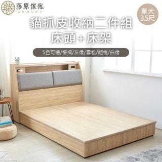 藤原傢俬 貓抓皮靠枕收納床頭箱附充電插座單人加大3.5尺+6分木芯板床架/底(床頭+床架)