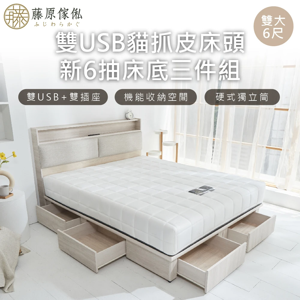 藤原傢俬 白梧桐雙USB貓抓皮6抽床組6尺雙人加大(雙USB貓抓床頭+新6抽床底/床架+白色戀人床墊)