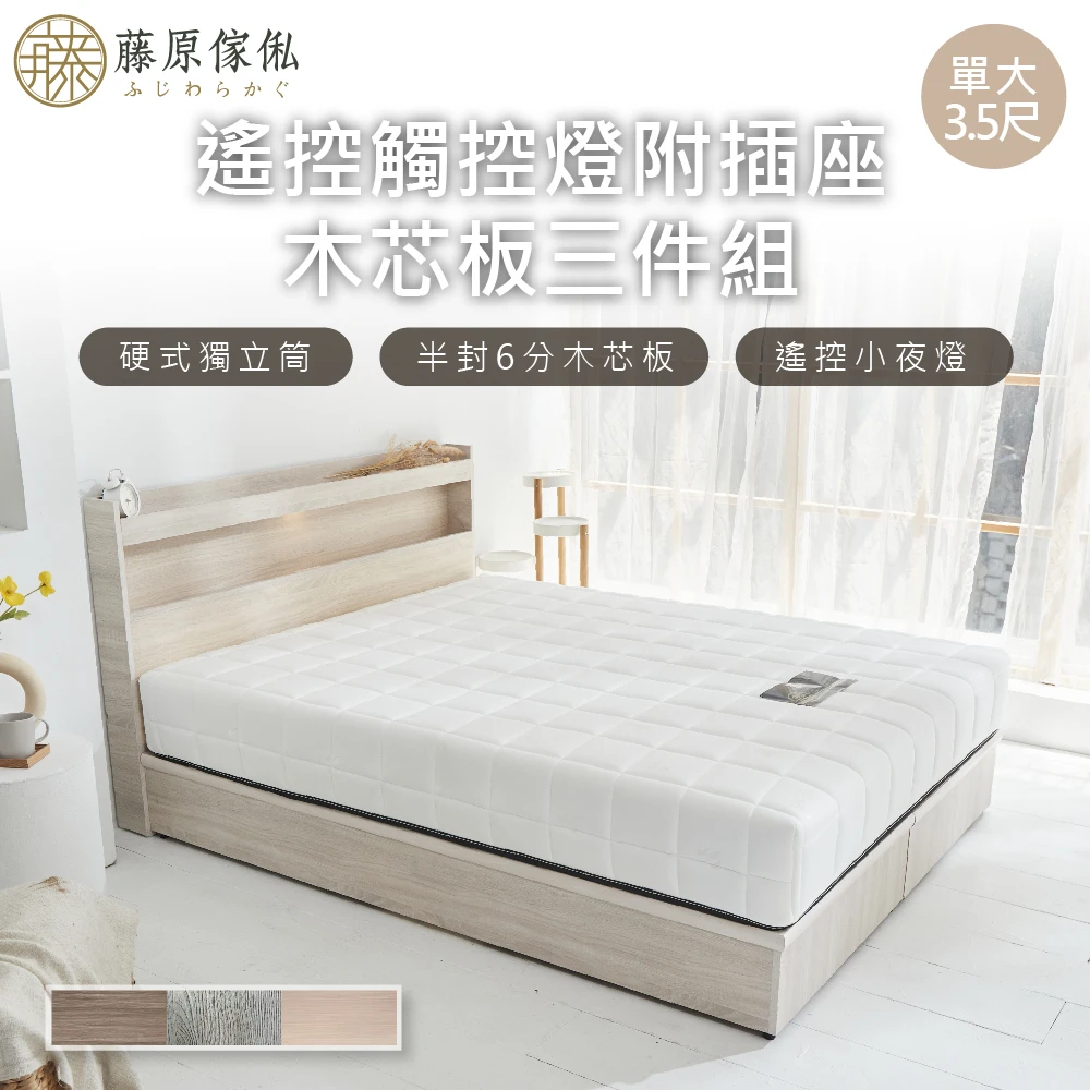藤原傢俬 遙控/觸控燈附插座木芯板三件式床組3.5尺單人加大(6分床架床底+床頭+白色戀人硬式床墊)