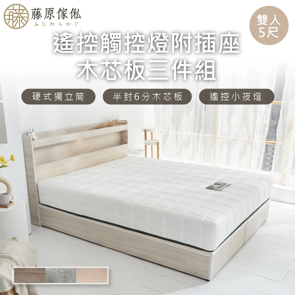 藤原傢俬 遙控/觸控燈附插座木芯板三件式床組5尺雙人(6分床架床底+床頭+白色戀人硬式床墊)