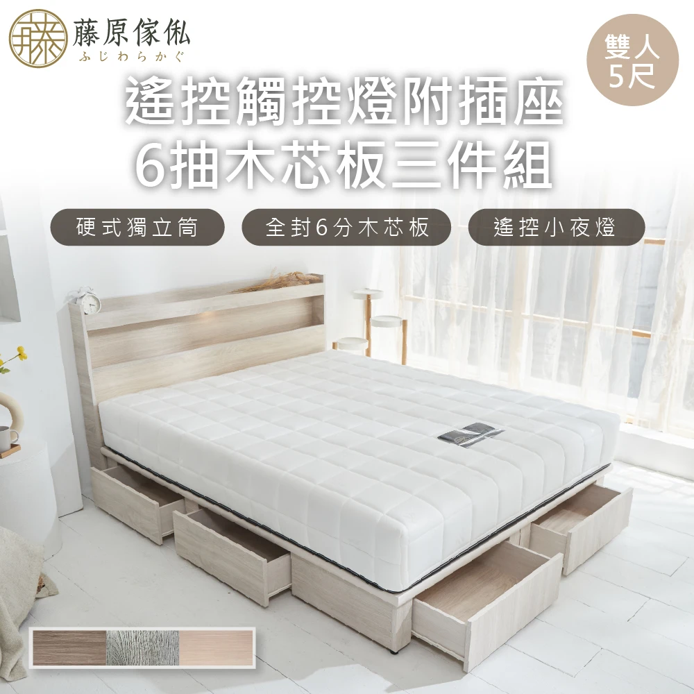 藤原傢俬 遙控/觸控燈附插座三件式床組5尺雙人(新6抽床架床底+床頭+白色戀人硬式床墊)
