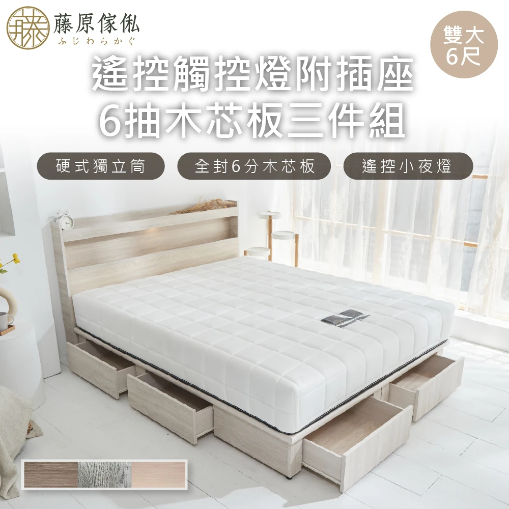 藤原傢俬 遙控/觸控燈附插座三件式床組6尺雙人加大(新6抽床架床底+床頭+白色戀人硬式床墊)