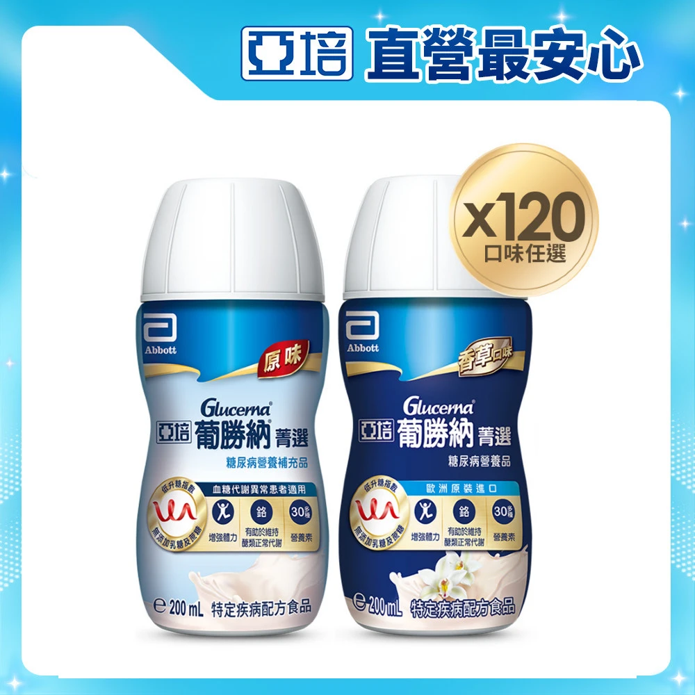 亞培 任選-葡勝納菁選即飲糖尿病營養品-原味+纖維/香草口味(200mlx24入x5箱)(糖尿病適用)