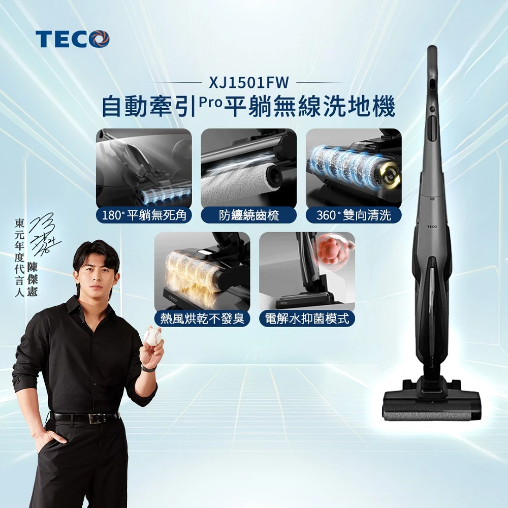 陳傑憲代言TECO 東元 自動牽引Pro平躺無線洗地機 XJ1501FW(15Kpa/180度平躺/5分鐘熱烘/電解水除菌)