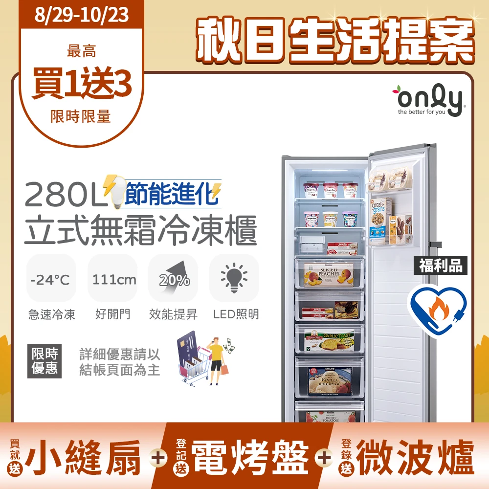 only 贈DC變頻小縫扇-熱賣近百台!好取式400L變頻無霜冷凍櫃OU400-M02ZI福利品(節能標章直立式)