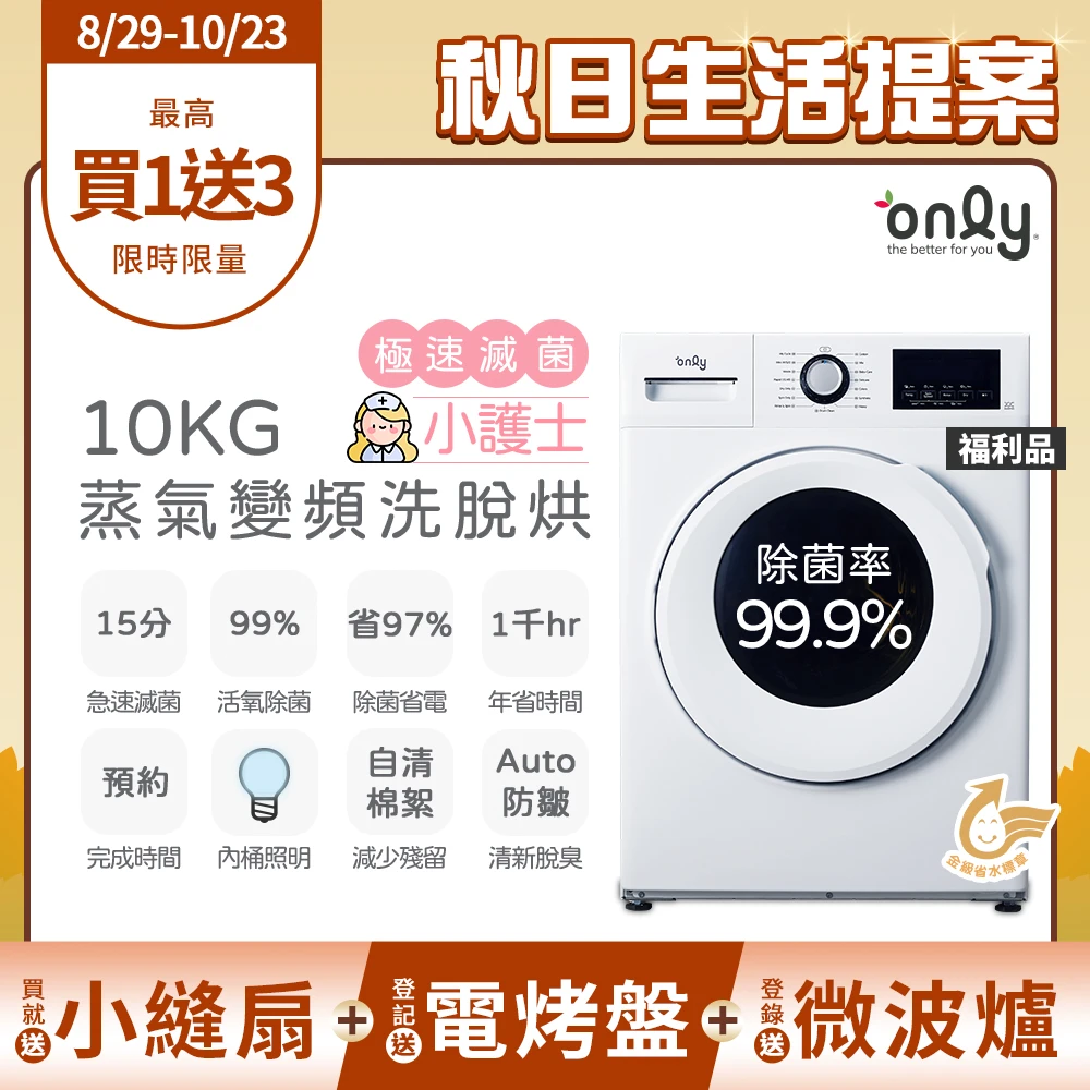only 贈小縫扇-小護士10kg急速滅菌洗脫烘OF10-W41A福利品(金級省水變頻蒸氣活氧滾筒洗衣機 贈品值$1990)