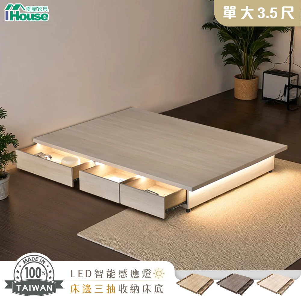 IHouse 保羅 單大3.5尺 智能感應燈光+3抽收納床底 台灣製木心板(床底/床座/床架)