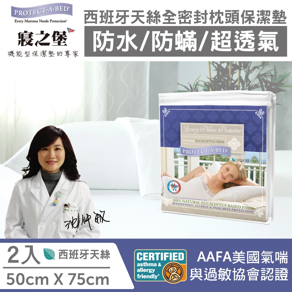 美國寢之堡 西班牙天絲100%防水防蹣枕頭保潔墊(50x75cm 2入)