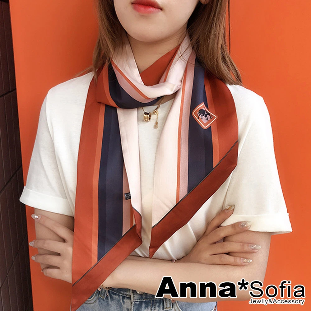 AnnaSofia 仿絲領巾絲巾圍巾-條紋象影斜角 窄版緞面 現貨(橘咖系)