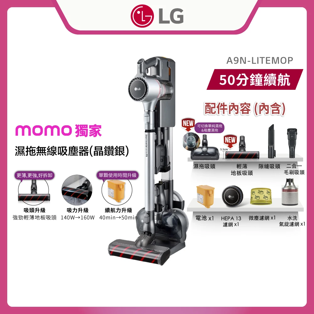 LG 樂金 A9+濕拖無線吸塵器A9N-LITEMOP(晶鑽銀/乾吸濕拖/momo獨家/多功能收納立架)