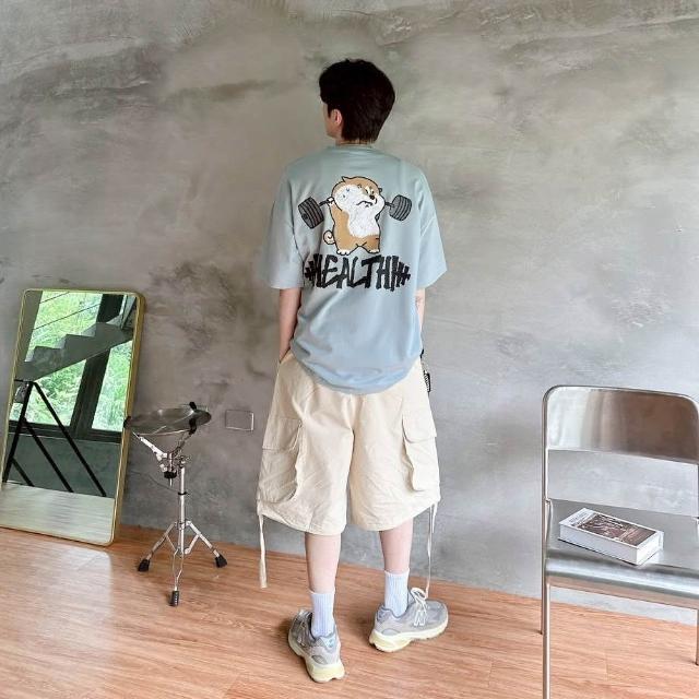 J.Malo韓版HEALTH柴犬舉重印花短T | 男款寬鬆短袖T恤 細絨棉潮流TEE 可愛柴犬圖案百搭休閒上衣