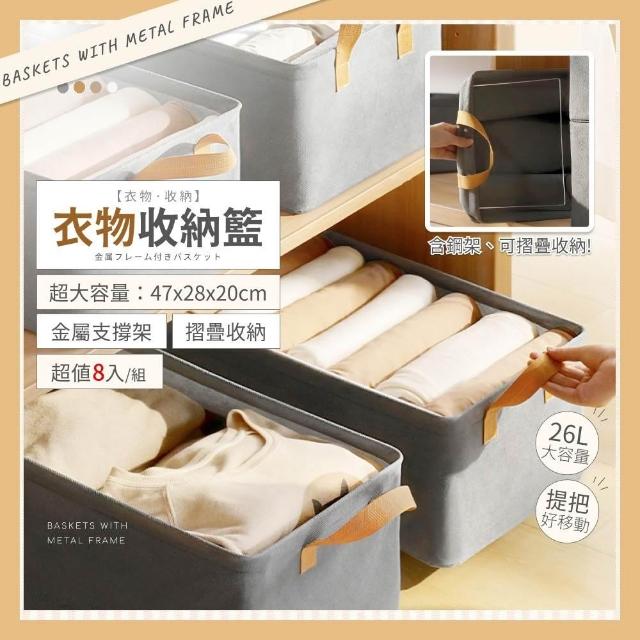 小宅收納大容量可折疊收納籃含鋼架 8入組 (內有鋼架支撐 收納箱 衣物收納籃 帶蓋收納籃 摺疊收納 衣櫃收納)