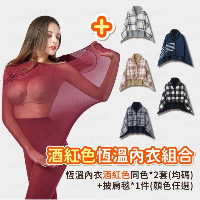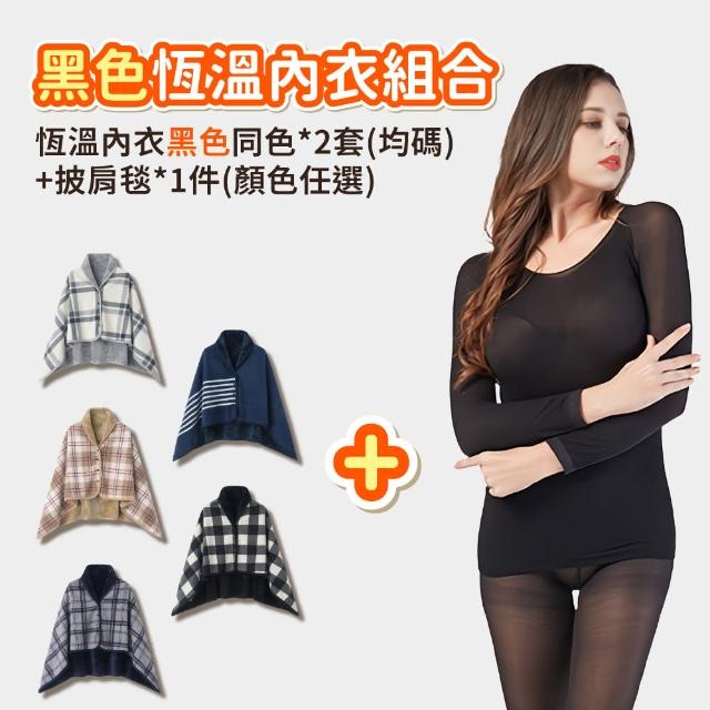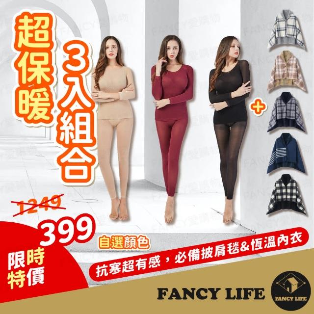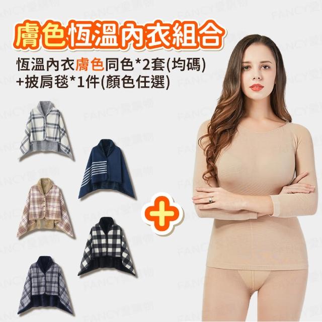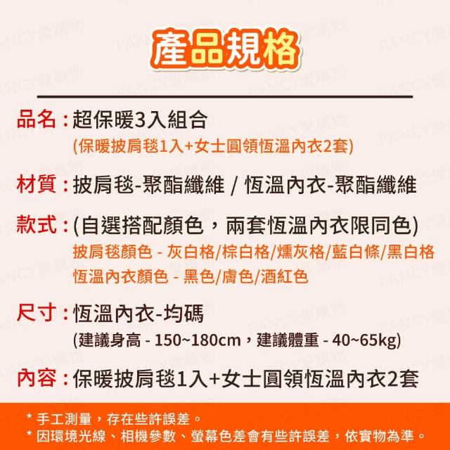 FANCY LIFE超保暖3入組合(保暖披肩毯1入+女士圓領恆溫內衣2套)保暖衣 披肩 午睡毯 法蘭絨蓋毯 保暖衣 打底衣 超薄無痕內衣