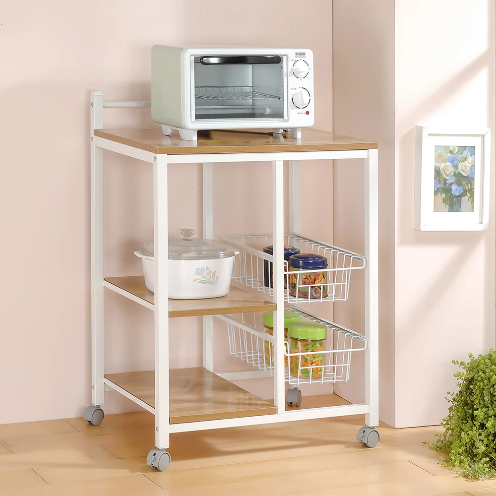 YCDMIT 三層雙籃附輪微波爐置物架廚房電器架 (移動式收納架 儲物架 層架 餐櫥架 可抽拉置物架)