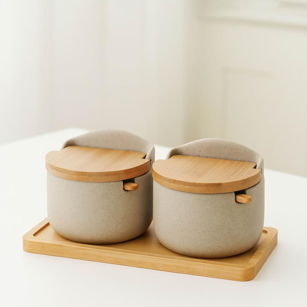 上手家居陶瓷竹木蓋調味罐 2罐組(調味料罐/鹽罐/調料罐/調味盒)