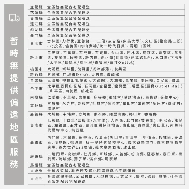 - 商店所提供的產品配送區域範圍目前僅限台灣本島。