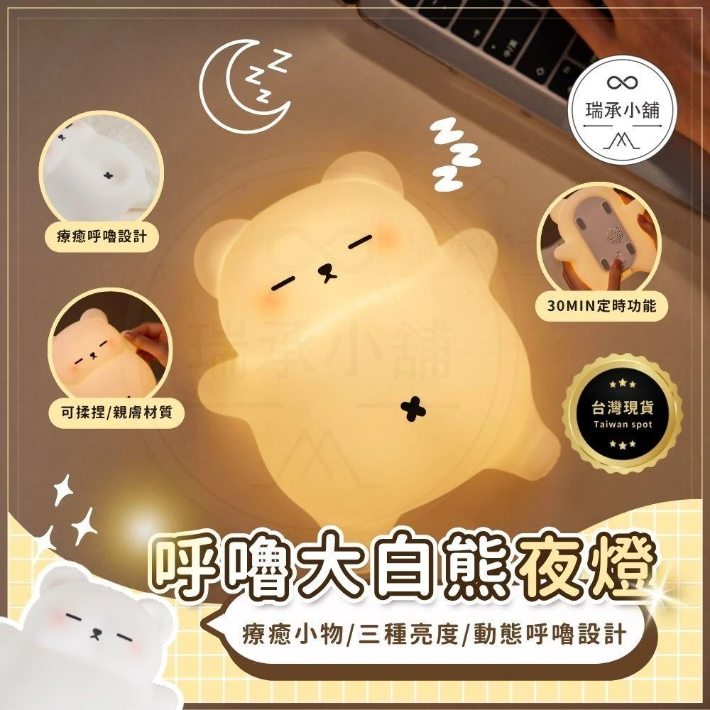 呼嚕大白熊夜燈 可愛小夜燈 拍拍燈 小夜燈 造型夜燈 led小夜燈 氛圍燈 充電夜燈 生日禮物 交換禮物