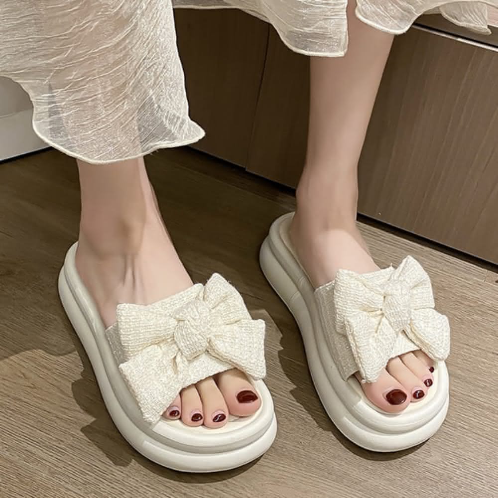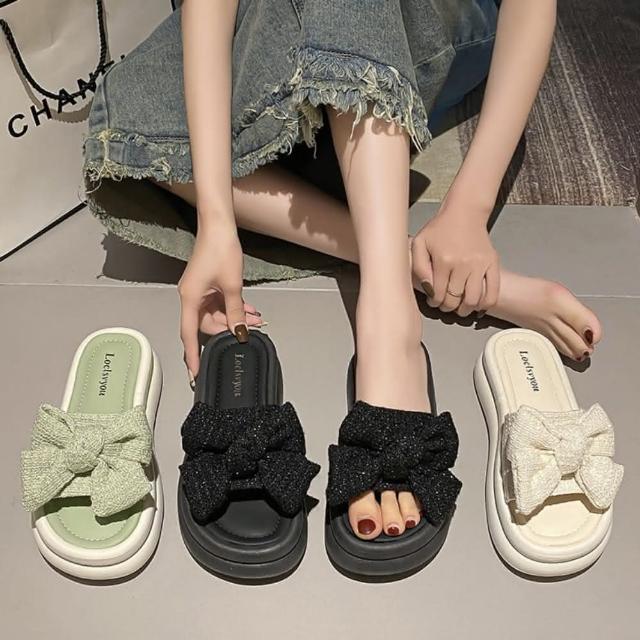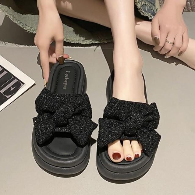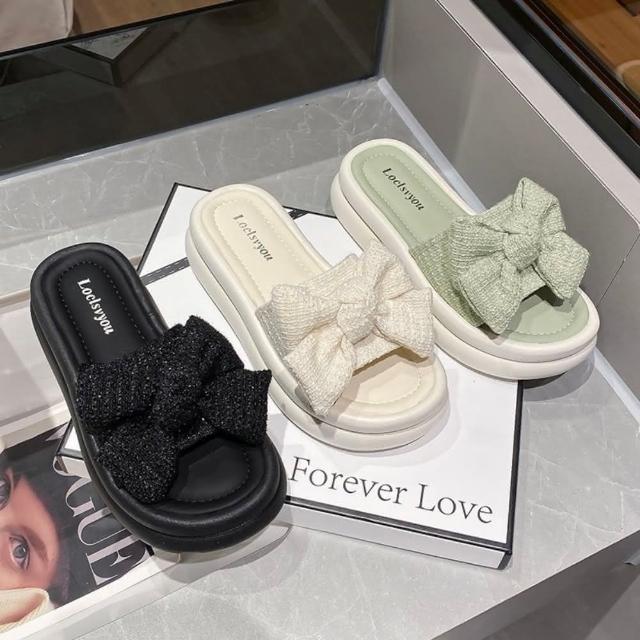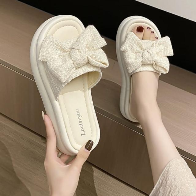 baibeauty 白鳥麗子甜美一字帶布面蝴蝶結平底拖鞋厚底鞋