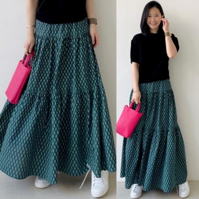 baibeauty 白鳥麗子日系撞色菱格高腰鬆緊蛋糕長裙裙子
