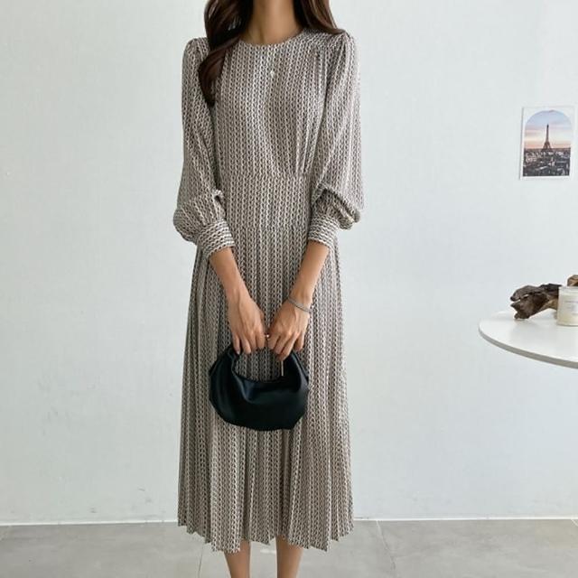 baibeauty 白鳥麗子百搭印花收腰圓領百褶裙長袖洋裝連身裙