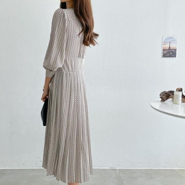 baibeauty 白鳥麗子百搭印花收腰圓領百褶裙長袖洋裝連身裙