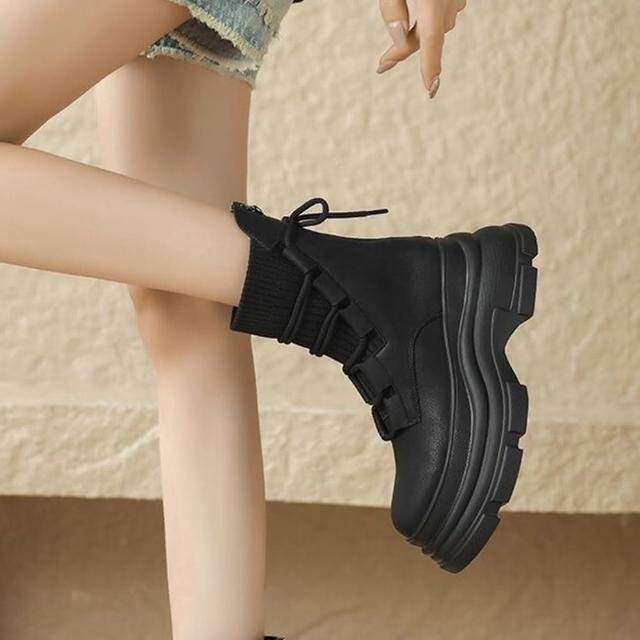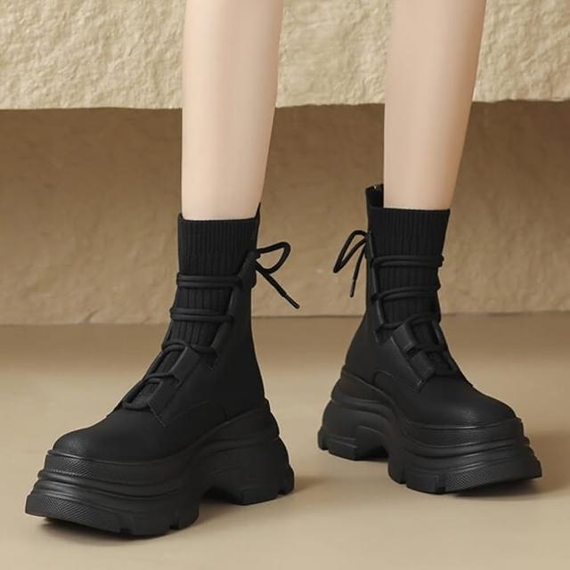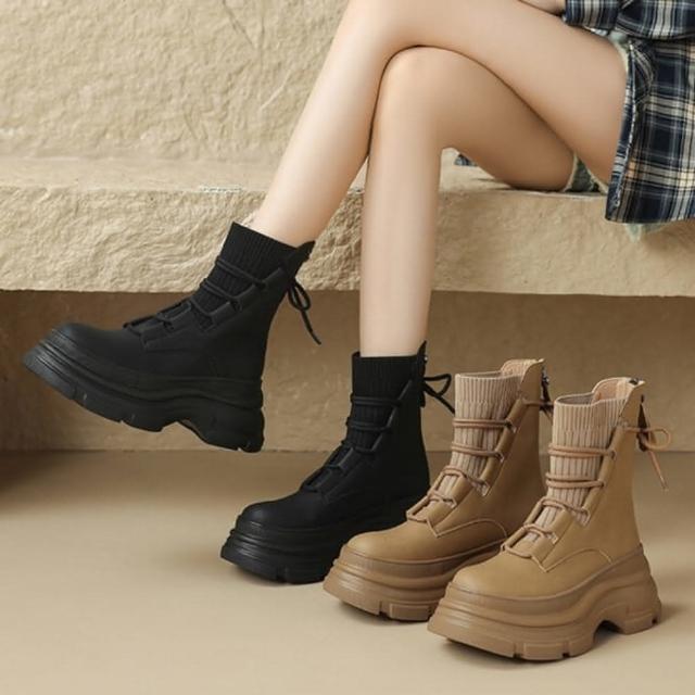 baibeauty 白鳥麗子率性皮革針織拼接繫帶後拉鍊短靴厚底靴