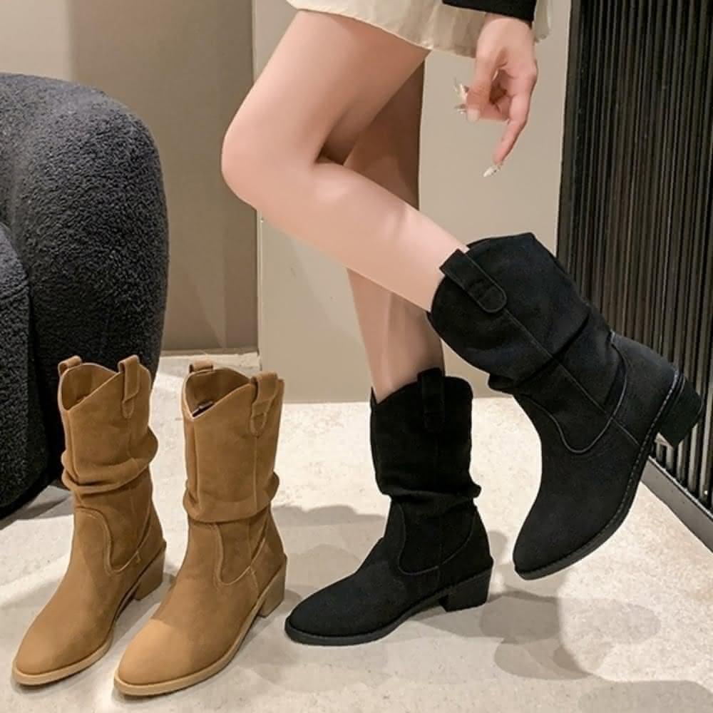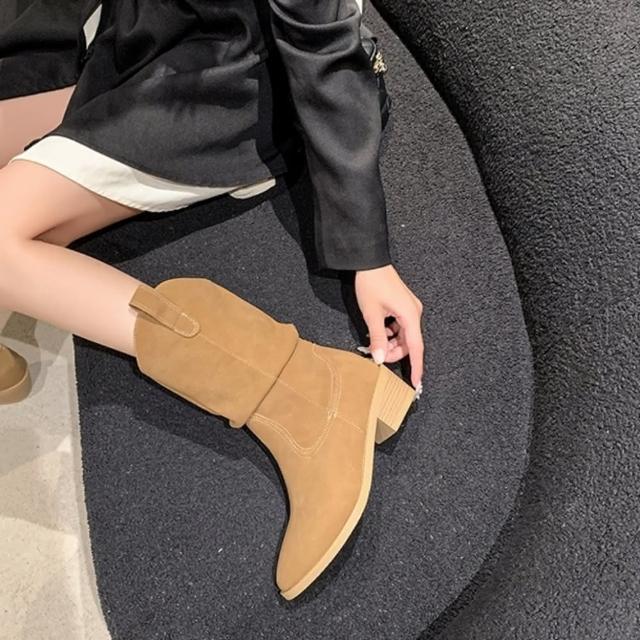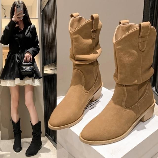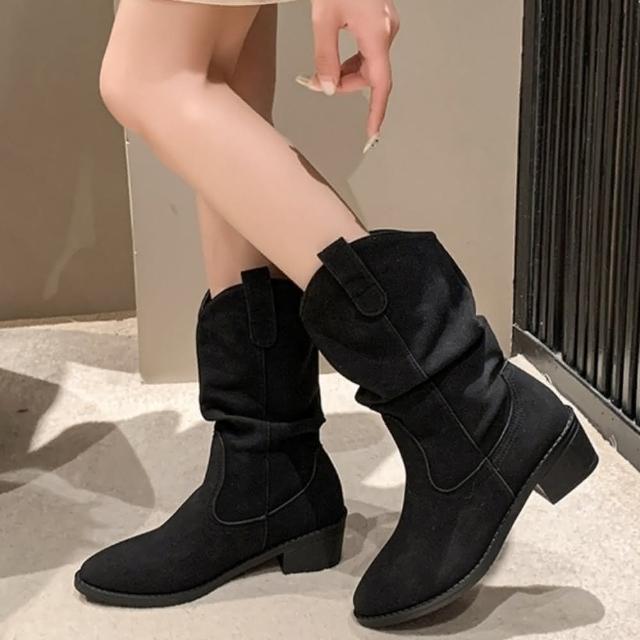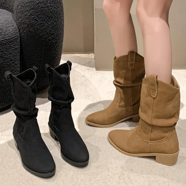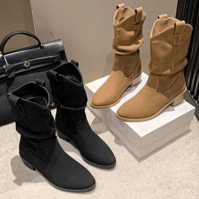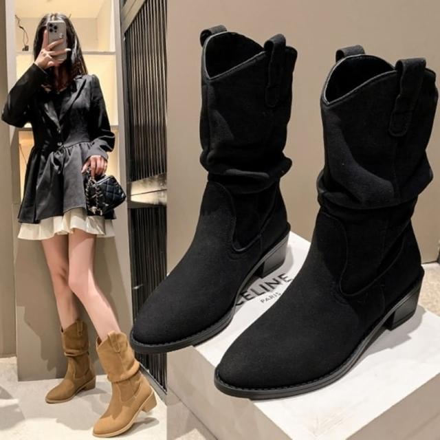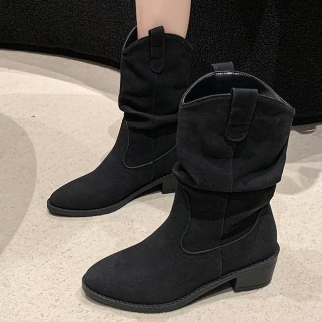 baibeauty 白鳥麗子簡約純色皺摺V口尖頭粗跟靴35-43全尺碼中筒靴