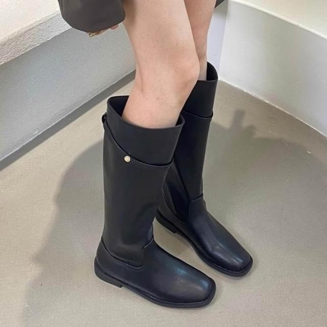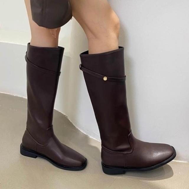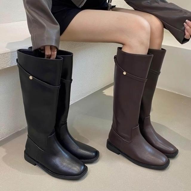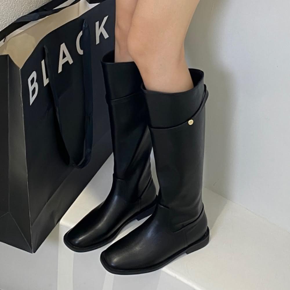 baibeauty 白鳥麗子韓風素面皮革金屬釦方頭寬筒低跟長靴馬靴