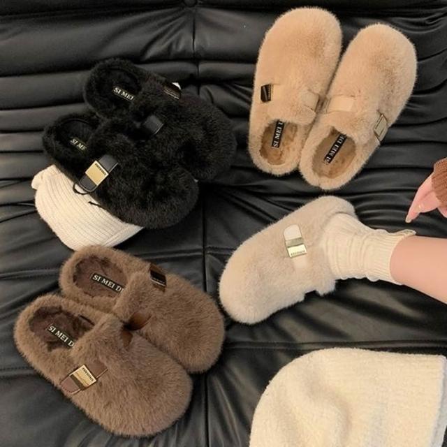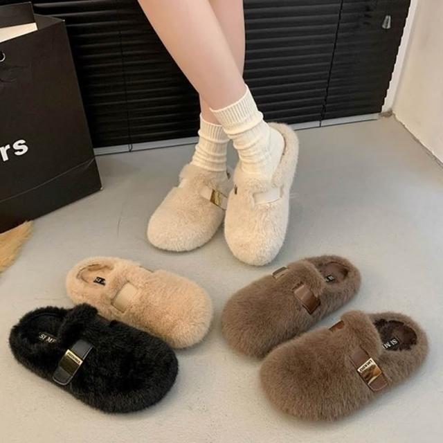baibeauty 白鳥麗子溫柔毛毛拼接一字帶金屬厚底拖鞋穆勒鞋