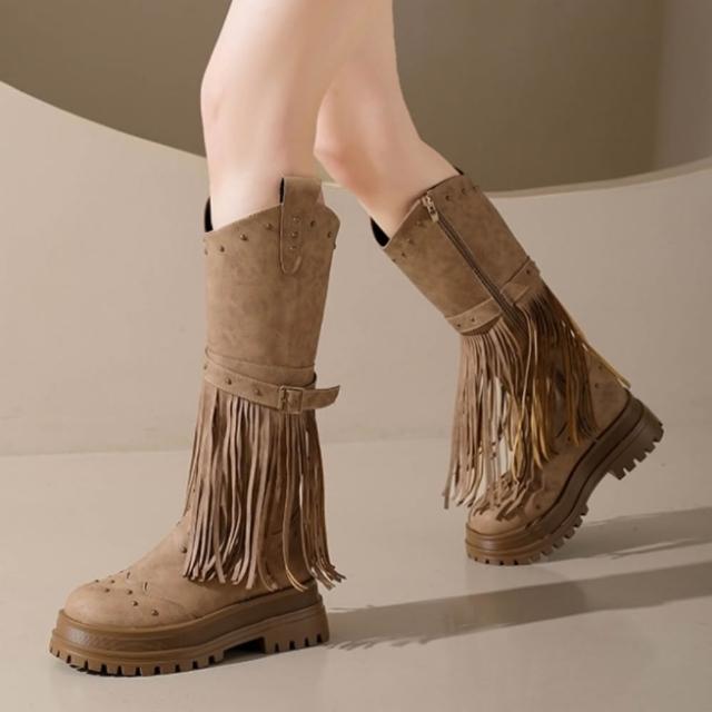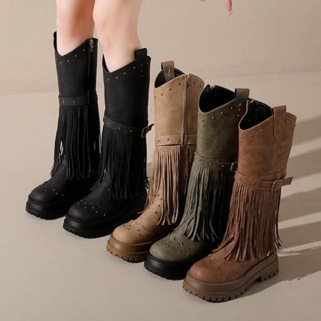 baibeauty 白鳥麗子帥氣V型鉚釘流蘇皮帶釦側拉鍊厚底長靴馬靴 35-42全尺碼