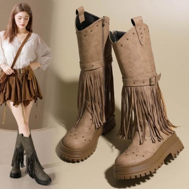 baibeauty 白鳥麗子帥氣V型鉚釘流蘇皮帶釦側拉鍊厚底長靴馬靴 35-42全尺碼
