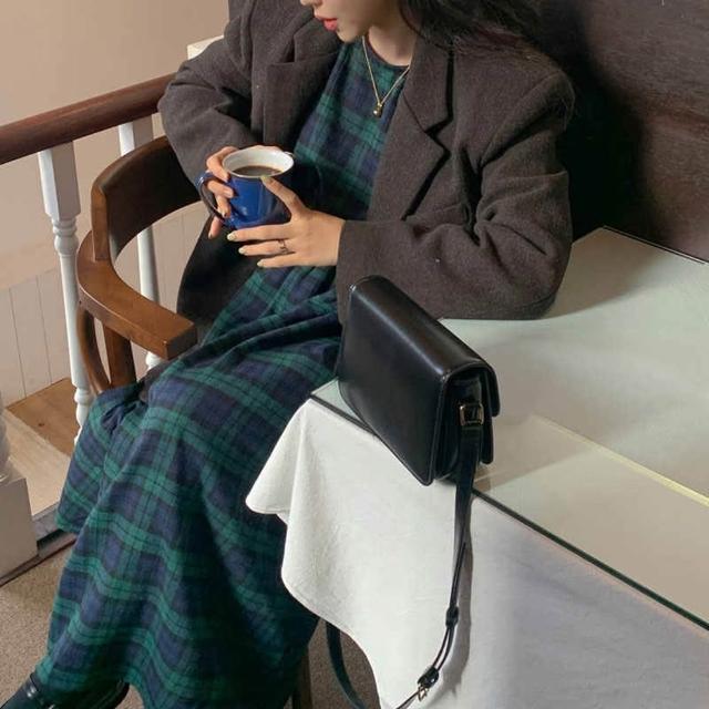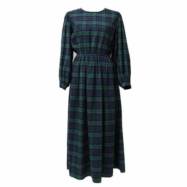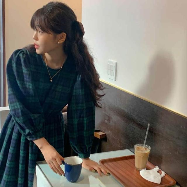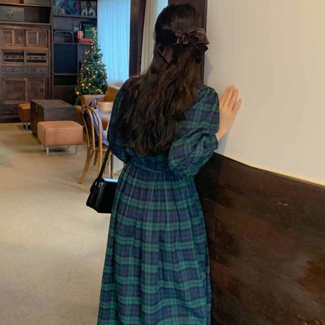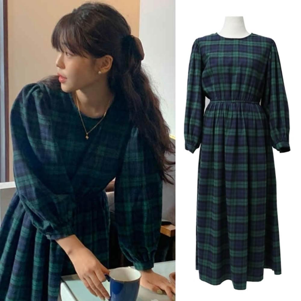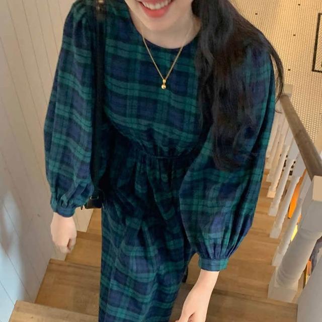 baibeauty 白鳥麗子連身裙.日系復古格紋鬆緊收腰圓領長袖洋裝