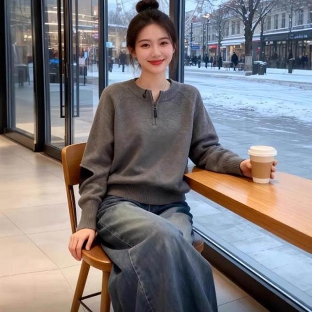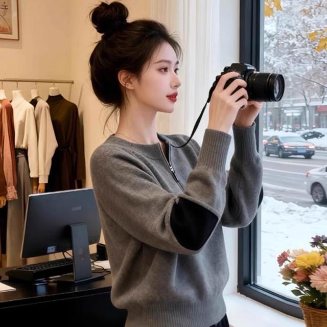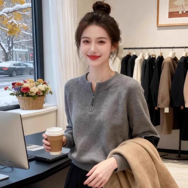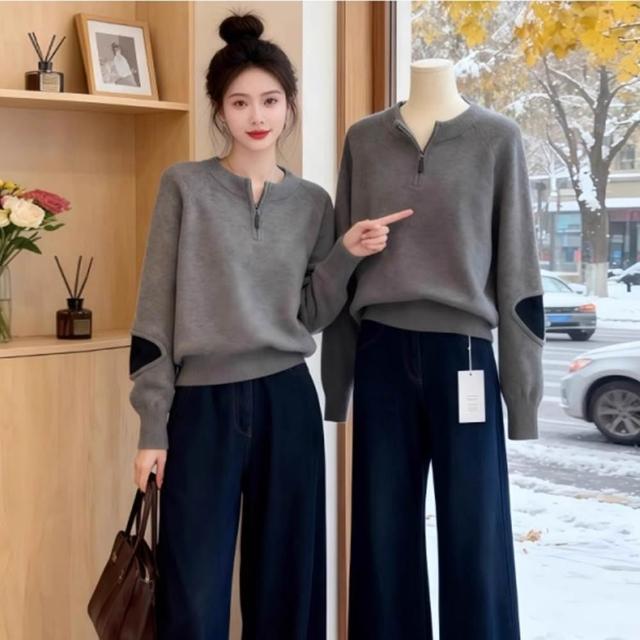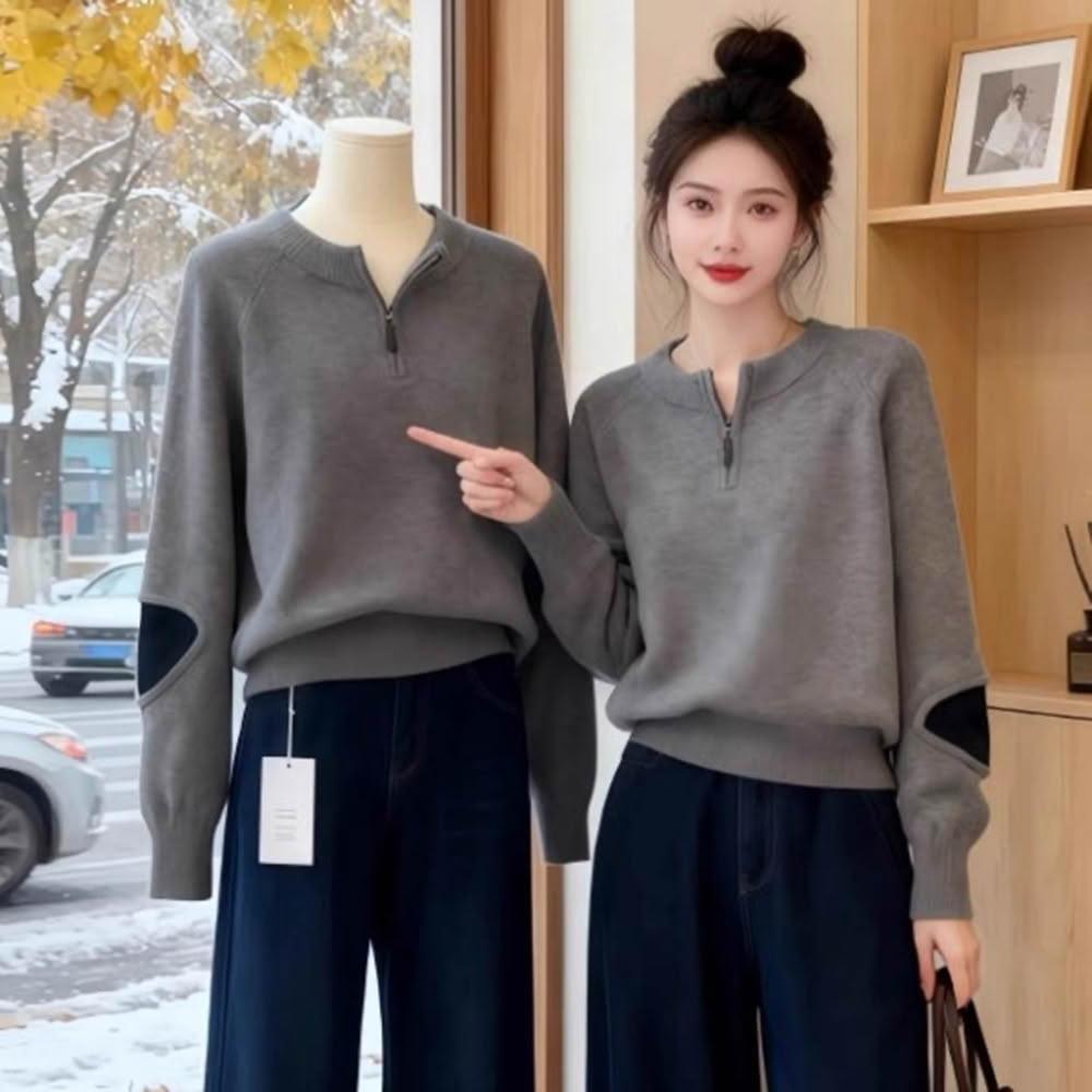 baibeauty 白鳥麗子針織衫.簡約素色拼接半拉鍊立領長袖上衣
