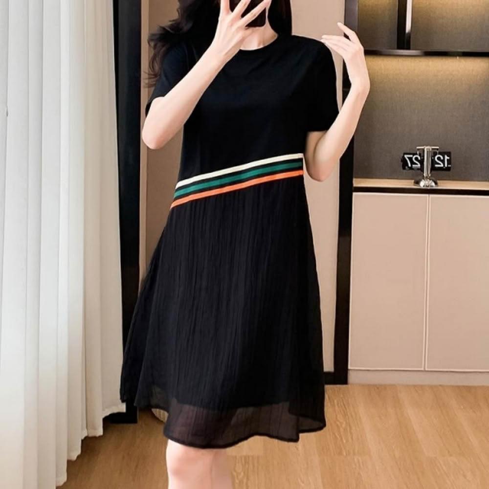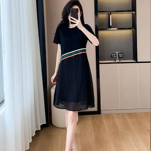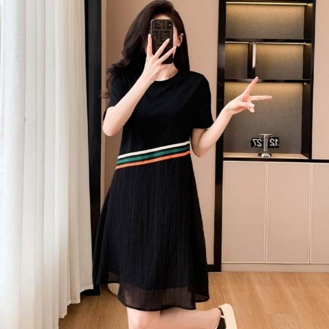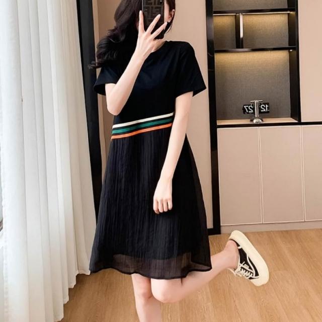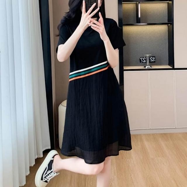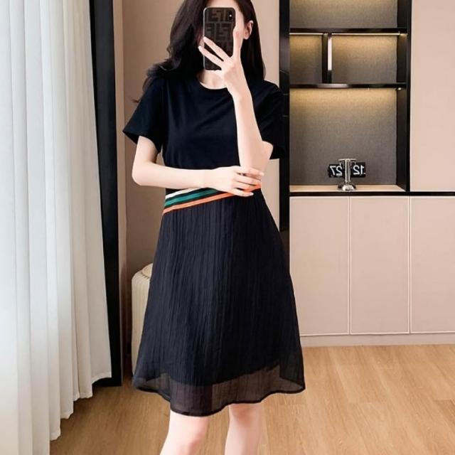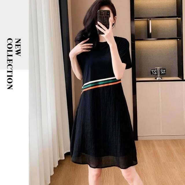 baibeauty 白鳥麗子連身裙.青春減齡撞色拼接雪紡圓領短袖洋裝
