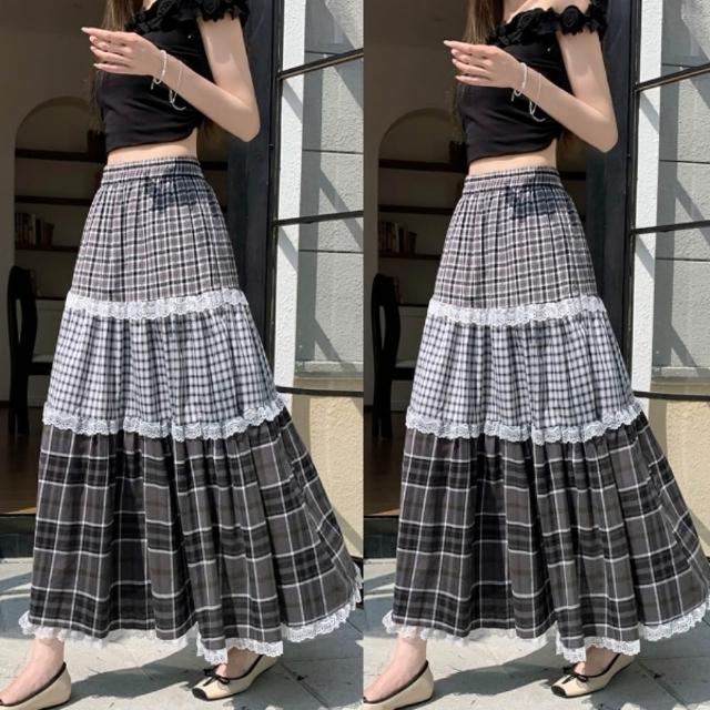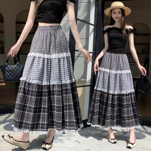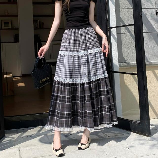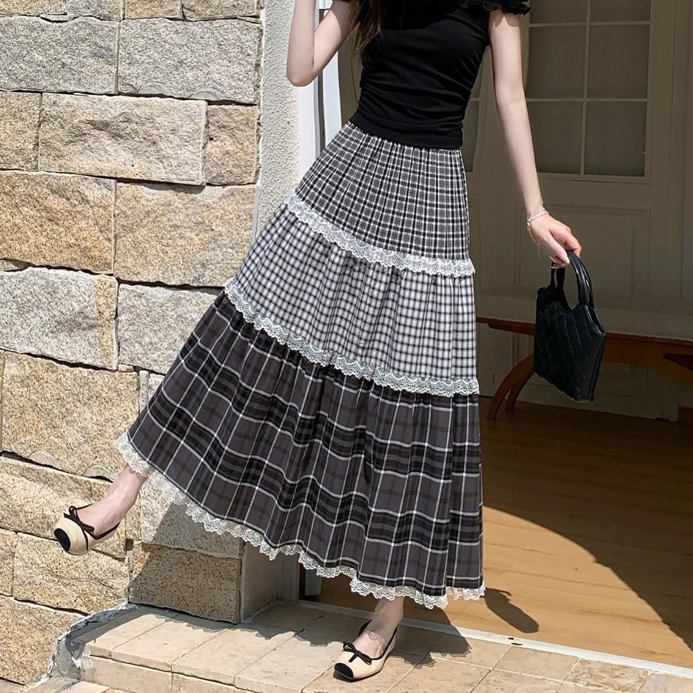 baibeauty 白鳥麗子裙子.經典格紋拼接蕾絲高腰鬆緊蛋糕長裙