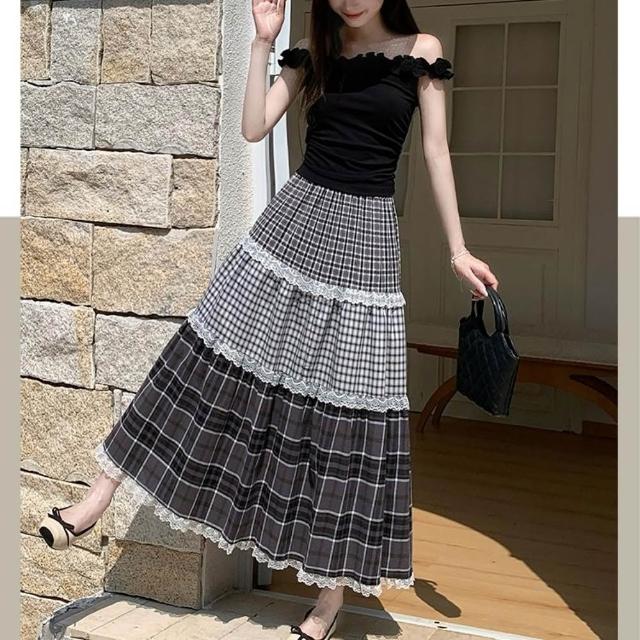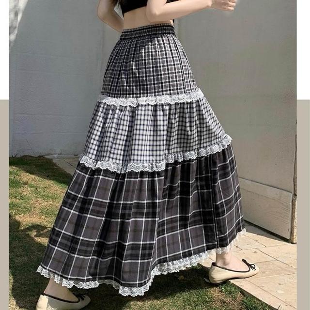 baibeauty 白鳥麗子裙子.經典格紋拼接蕾絲高腰鬆緊蛋糕長裙