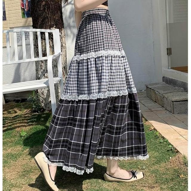 baibeauty 白鳥麗子裙子.經典格紋拼接蕾絲高腰鬆緊蛋糕長裙