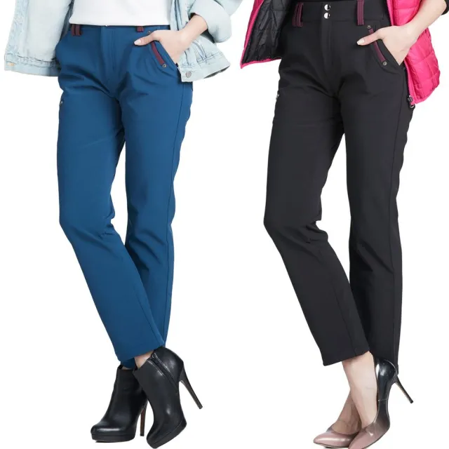戶外趣女款石墨烯FIR-X禦寒昇溫防風防潑水三層暖殼褲抓絨長褲(HPL010 靛藍/黑色)