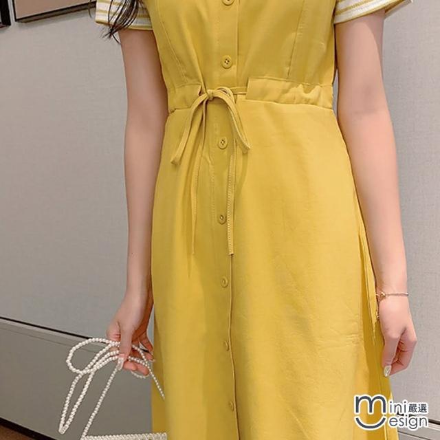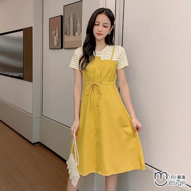 Mini 嚴選法式收腰圓領假兩件連身裙(黃色 洋裝)
