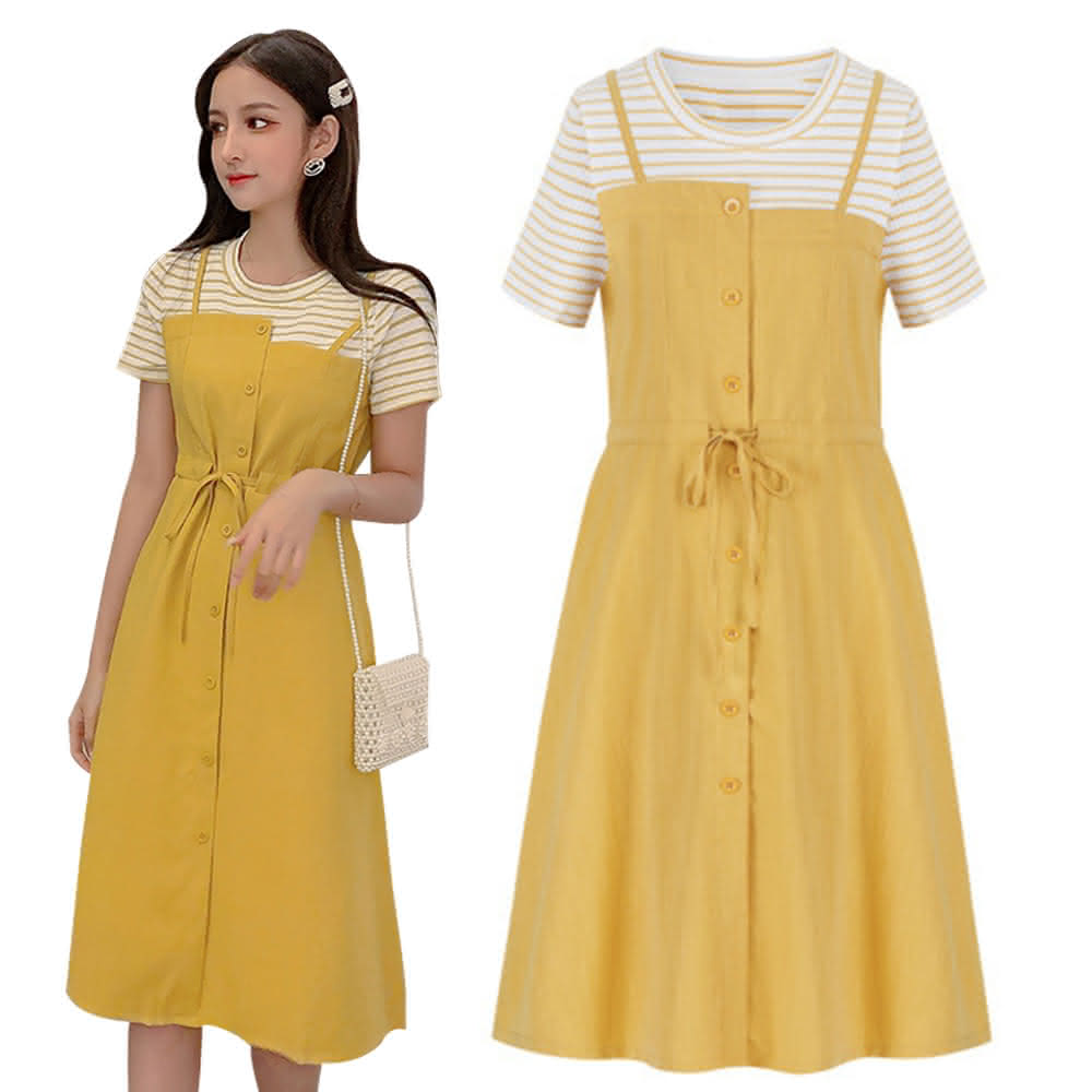 Mini 嚴選法式收腰圓領假兩件連身裙(黃色 洋裝)