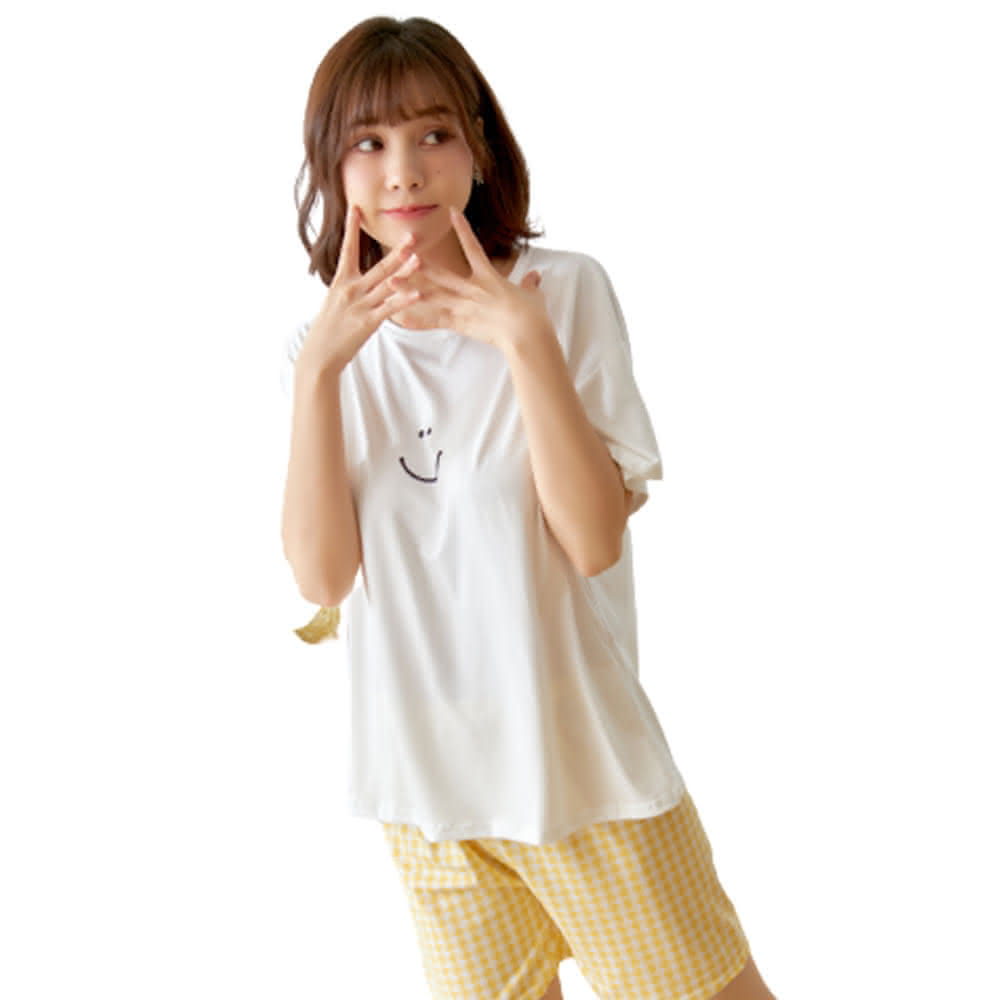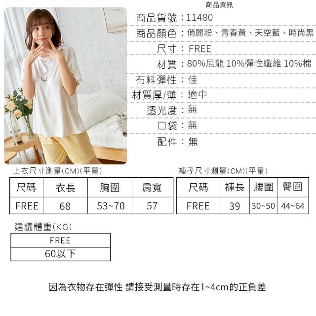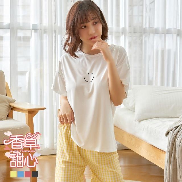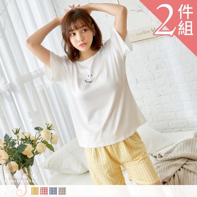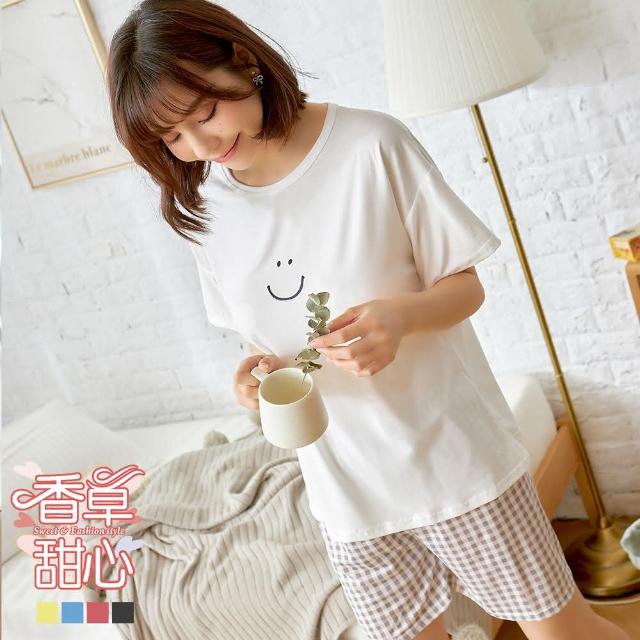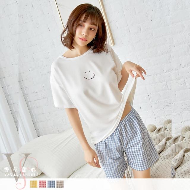 香草甜心2套組 微笑素色短袖上衣搭配格紋短褲成套睡衣 11480家居服 兩件式睡衣 女生睡衣