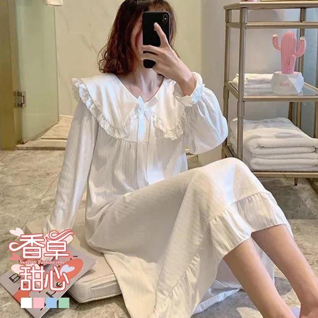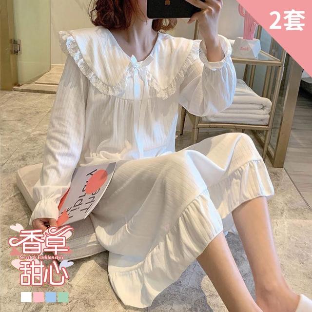 香草甜心買一送一 可愛公主風蝴蝶結直紋棉質親膚長袖睡裙 2件組-11446居家服 連衣裙 睡衣裙 膝長款
