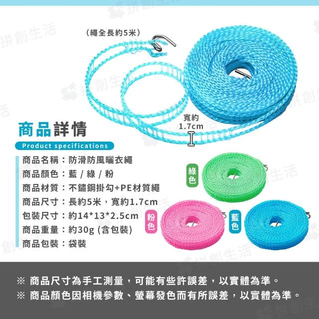 拼創生活5米防滑防風曬衣繩(3色任選;晾衣繩/掛衣繩/晾曬繩/防滑曬衣繩/戶外晾衣繩/居家曬衣繩)