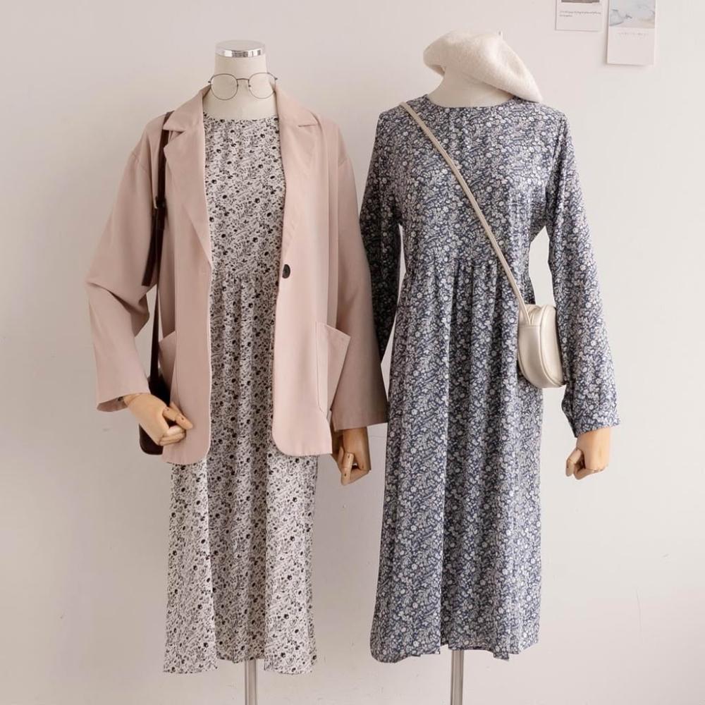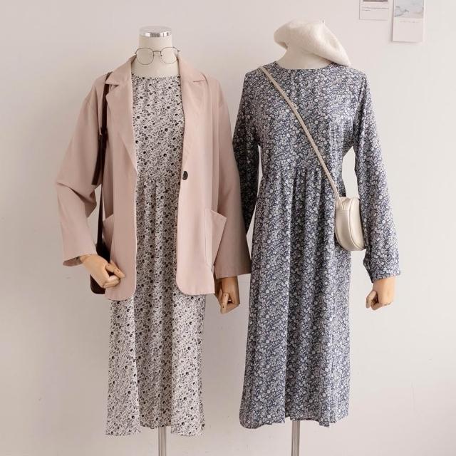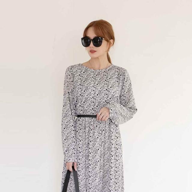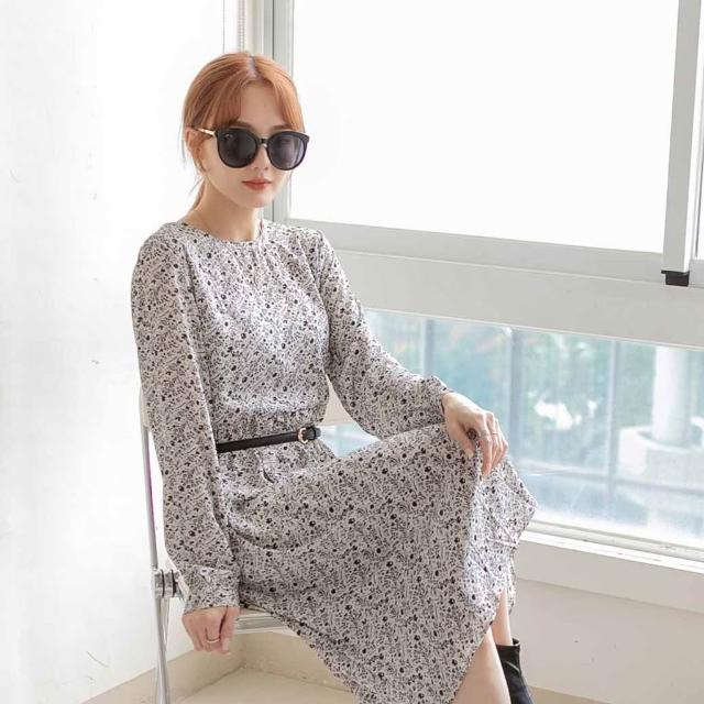 MUMUSHOPMUMU O10580 長袖碎花連身裙 圓領洋裝 收腰顯瘦 連身裙 長袖連身洋裝 長裙 長袖洋裝 過膝長洋裝 長裙女