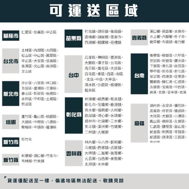 - 針對大型商品(包括:大型家電、家具床墊、健身按摩器材、車類...等),商店將於完成收款確認後,一天內〈不含例假日〉將會有專人與您確認相關配送細節等的聯繫。偏遠地區、樓層費及其它加價費用,皆由商店於約定配送時一併告知,商店將保留出貨與否的權利。
