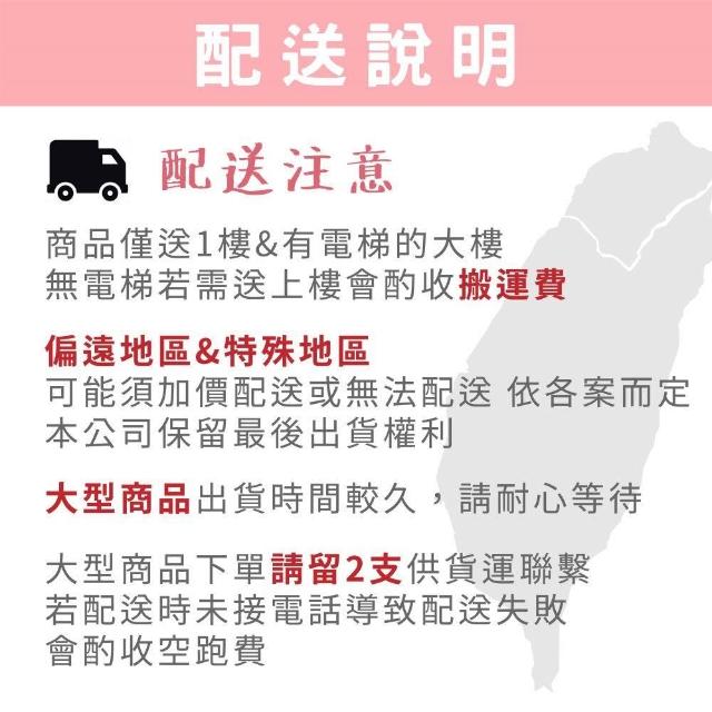 - 針對大型商品(包括:大型家電、家具床墊、健身按摩器材、車類...等),商店將於完成收款確認後,一天內〈不含例假日〉將會有專人與您確認相關配送細節等的聯繫。偏遠地區、樓層費及其它加價費用,皆由商店於約定配送時一併告知,商店將保留出貨與否的權利。