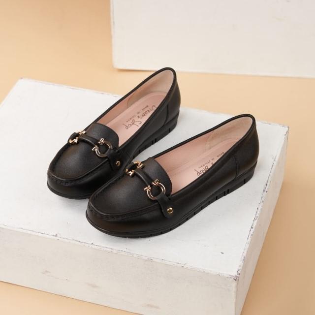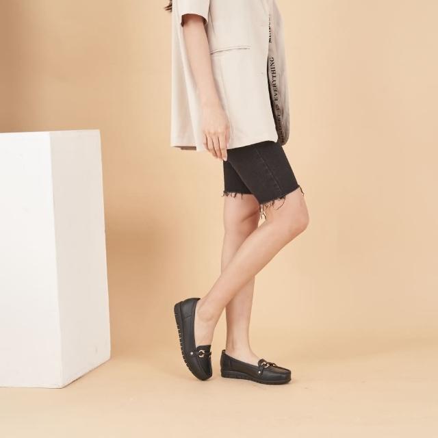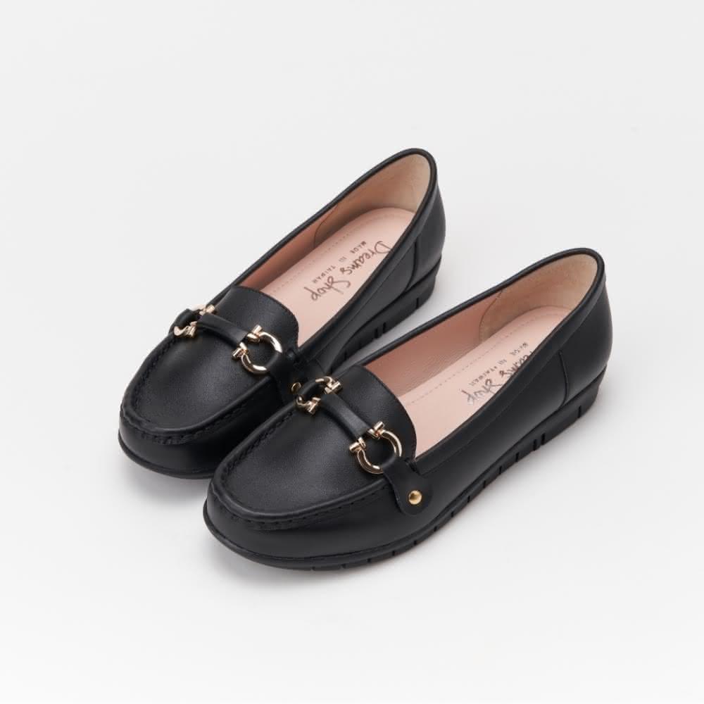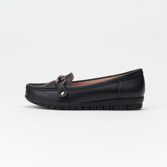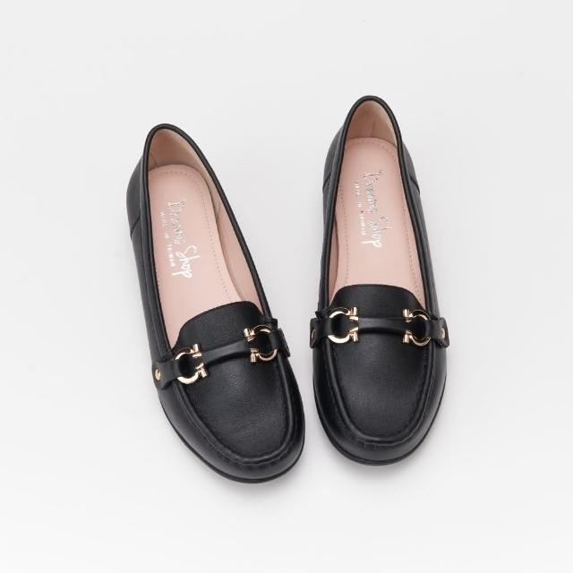 DREAMS SHOP寬楦氣墊_MIT真皮馬銜釦縫線平底樂福鞋 黑色 大尺碼女鞋36-45 面試上班鞋